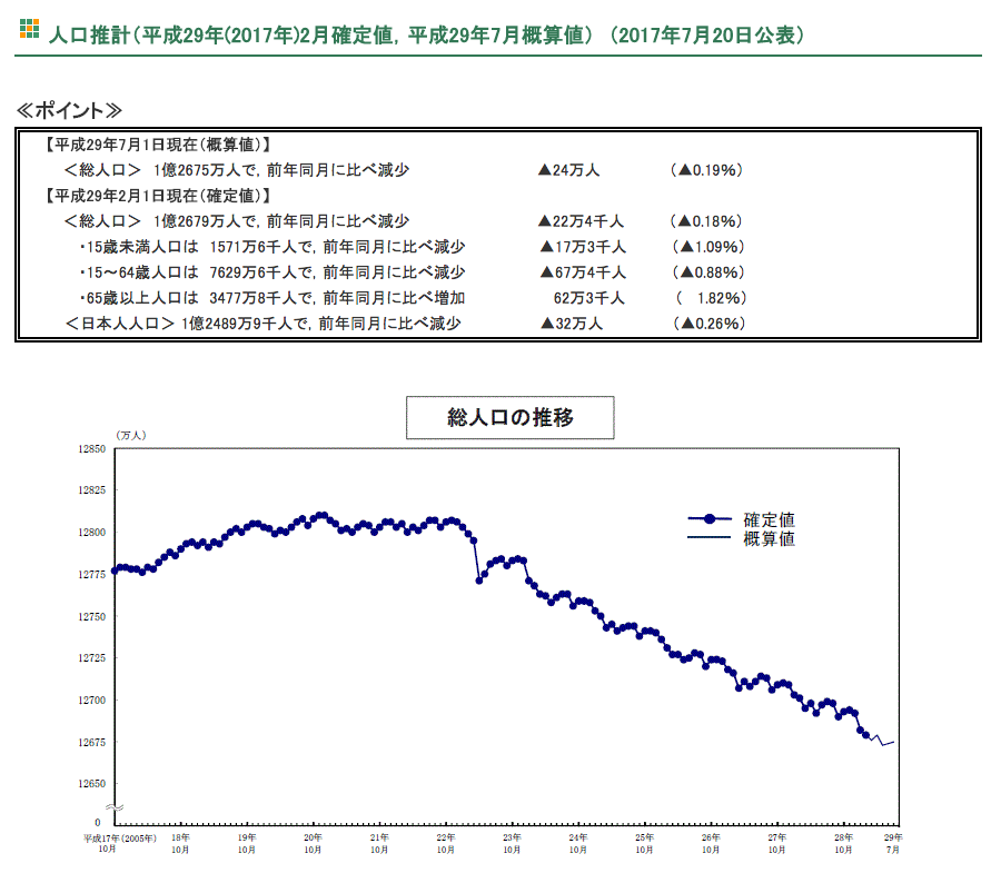 総務省統計局から出ているグラフを見てもわかるように人口は減る一方である。