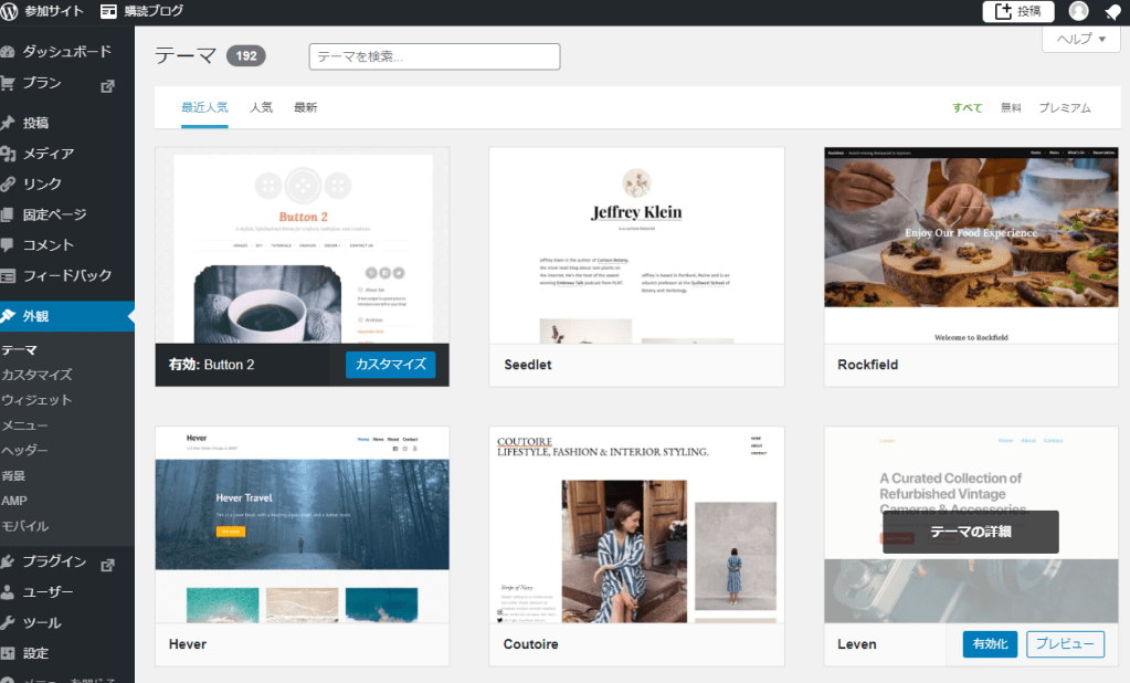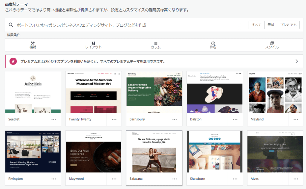 ここで「機能」「レイアウト」「カラム」「件名」「スタイル」などを選んでご自身に合うテーマを探してみるのがいいでしょう。