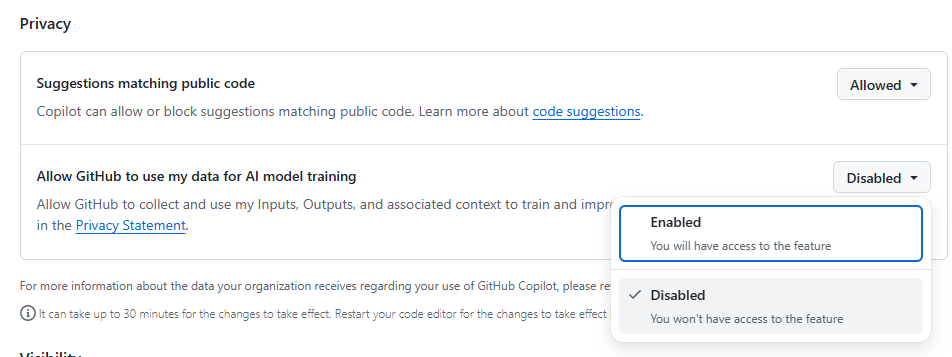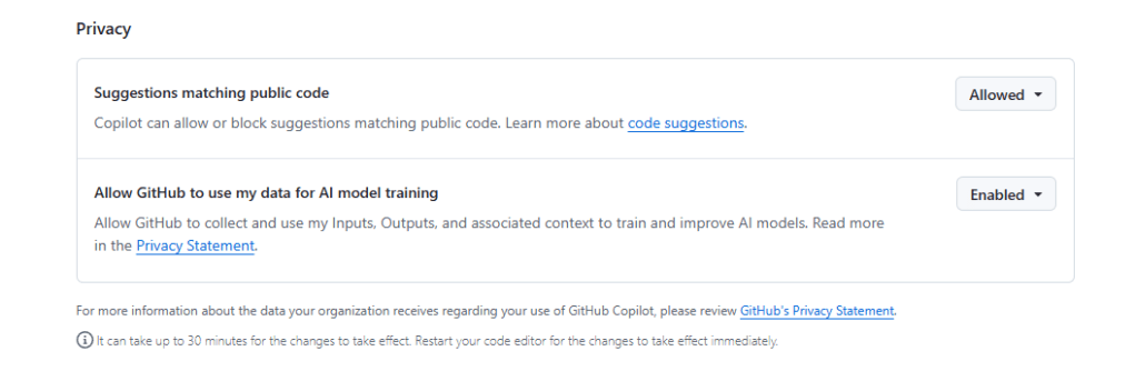 「Allow GitHub to use my data for AI model traning」があるのでデフォルトでは「Enable」=利用OKになっていますので、これを「Disable」=利用NGにすることでプライバシーが保たれます。