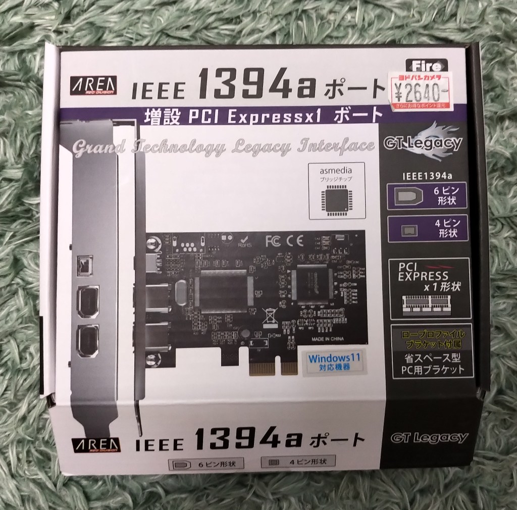 先日、カメラやデッキからテープデータを取り込むために1394a PCI-eボード(2640円でした)を買ったばかり(断捨離しているのに)。