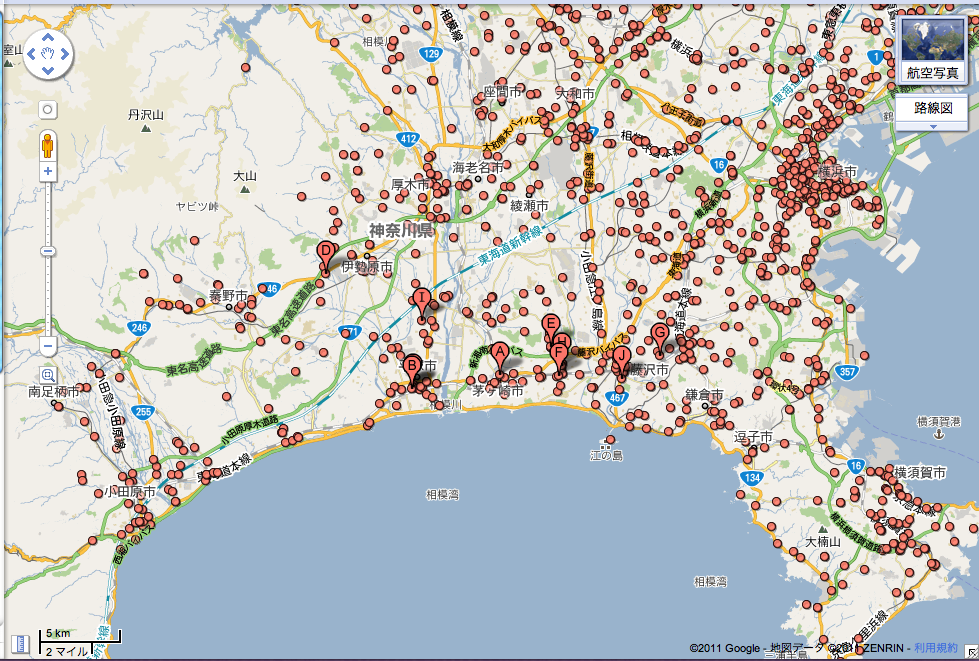 Googleで「葬儀 湘南」で調べて葬祭業に関係するマップを表示してみた。