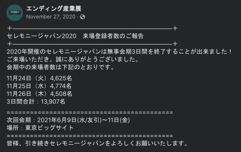 2021年6月9日〜11日の三日間、東京ビッグサイト青海展示棟にて第7回エンディング産業展及びセレモニージャパンが開催されました。