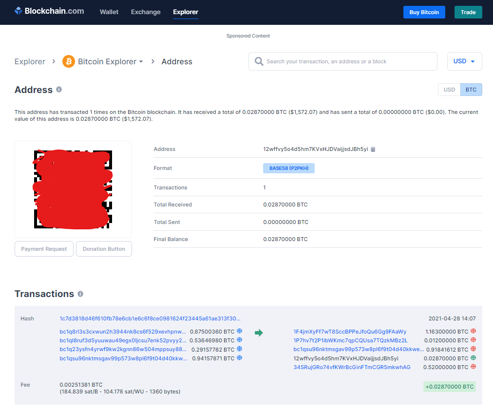 しかし、Blockchain.com で調べたら、どなたかがすでにお支払いされている・・・