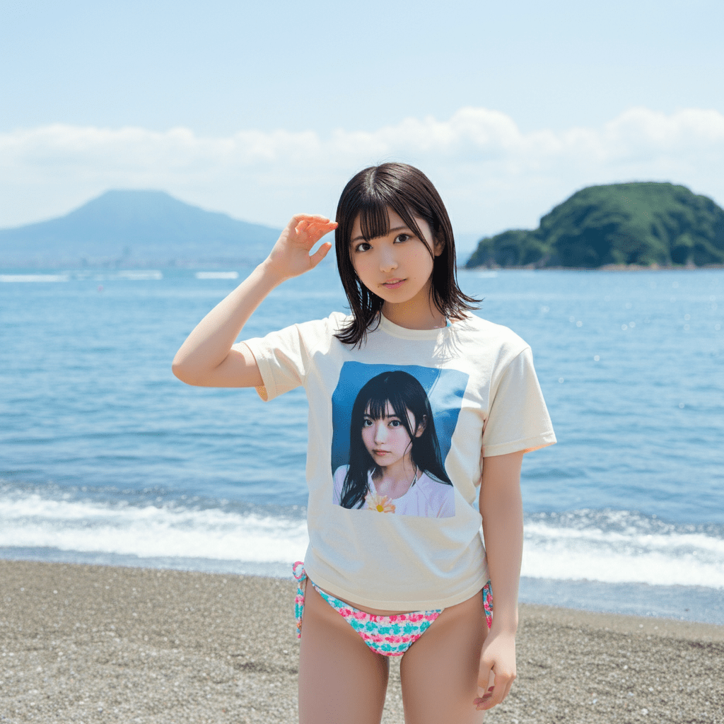 photorealistic Japanese girl wearing a T-shirt with a  picture of a flower and a bikini bottom on a hot summer day at a beach with a background of Enoshima island in Fujisawa .